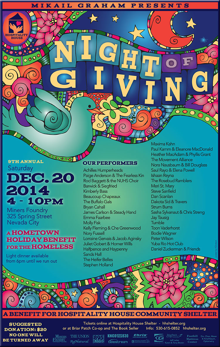 Por noveno año consecutivo, Mikail Graham presentará una velada con los mejores talentos locales en beneficio de Hospitality House. A Night of Giving, una fiesta navideña para toda la comunidad local, regresará a su sede en Miners Foundry en Nevada City el sábado 20 de diciembre. El evento se llevará a cabo de 4:00 a 10:00 en dos escenarios en el Fundición.