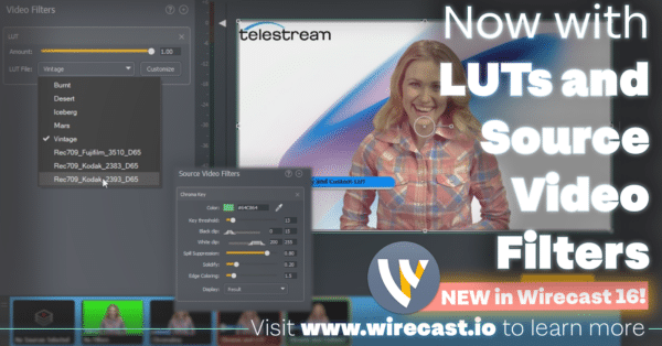 Hablando de valor de producción y marca, una característica que los usuarios de Wirecast han estado pidiendo finalmente está aquí: tablas de búsqueda personalizadas (o LUT). Aplique filtros precargados en la pestaña Filtros de video, como tono sepia, o cargue una LUT personalizada que represente su visión. Estas LUT se pueden cargar como archivos .cube estándar.